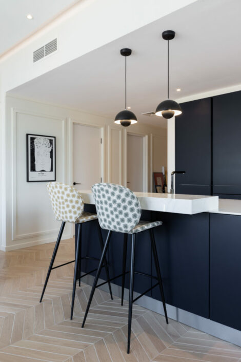 المطبخ من فئة next125 من مجموعة مطابخ Schüller الفاخرة، وتم اختيار اللون الأزرق النيلي لواجهاته، والأبيض الثلجي لسطح العمل، ويشار لأن سطح العمل مقترن بطاولة إفطار مصنوع من Calacatta Statuario، في النهاية شكل التصميم مزيجاً من الألوان والتشطيبات القائمة على أرضية بلاط خشبية جميلة مزينة بنمط الشيفرون.