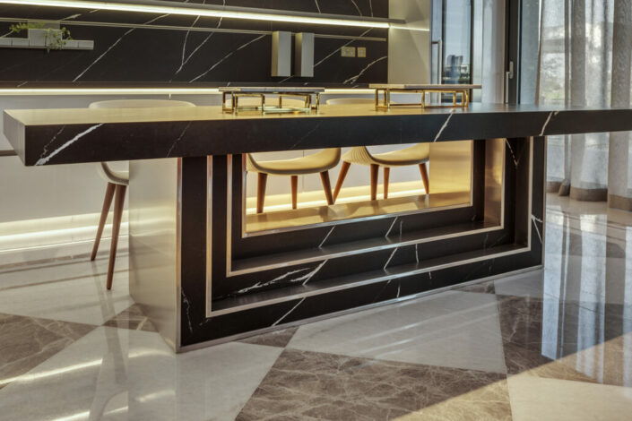 تم تصميم طاولة الطعام لتكون متوافقة مع رؤية المصمم بالاعتماد على نفس المواد عالية الأداء المخصصة لسطح التحضير، ويقتضي التصميم بأن تكون الطاولة بقياس 260×100 سم مدعمة بقاعدة هندسية تظهر وكأنها قطعة رخامية واحدة مكملة بجوانب من الكروم.