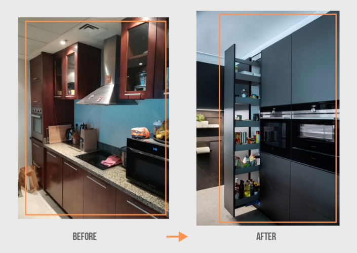 بإلقاء نظرة على الصور الخاصة بحالة المطبخ قبل وبعد ستلاحظ إجراء إعادة ترتيب لأماكن الطهي والعمل والمناطق الرطبة فيه.
