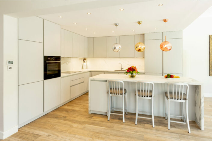 ولزيادة الأناقة في هذ التصميم اختير الدمج ما بين أنظمة النقر وقبضات المخفية ليكون مظهر الخزانات مسطحاً، أما عن السمات الوظيفية للمطبخ فهي مدعمة من خلال توفير مساحة تخزين واسعة في الجزيرة إلى جانب مساحة الجلوس المريحة التي توفرها.