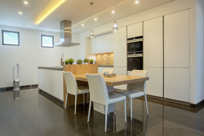 لا يقل اختيارنا لمطبخ Schüller.C لهذه الفيلا العائلية من تميزاً وفخامة عن فخامة فلل نخلة جميرا، وفي هذه المساحة الواسعة صممنا مطبخاً بلوحة فنية من الألوان المحايدة باستخدام الصفائح باللون الأبيض الكريستالي، وسطح العمل ذو الحجم المعزّز بصرياً بفضل اختياره من Quantum Quartz Tornado، وتم كذلك دمج لمسات ناعمة ودافئة في التصميم باختيار خشب البلوط الطبيعي للجدار الخلفي للمطبخ وبار الإفطار مع إدراج لوحة الأعشاب.