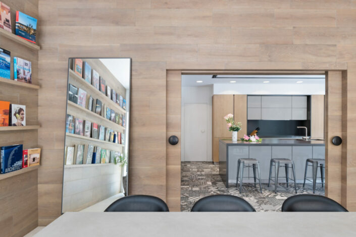 لتعزيز الشعور بالطبيعة في المطبخ فقد اختير تضمين باب انزلاقي ضخم على جانب واحد ليكون الفاصل ما بين الداخل (المطبخ) والخارج (الفناء الخلفي)، كما أن لقشرة البلوط دور في ذلك من خلال ما تمنحه من إحساس بامتلاء الداخل بالهواء الطلق.