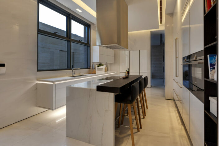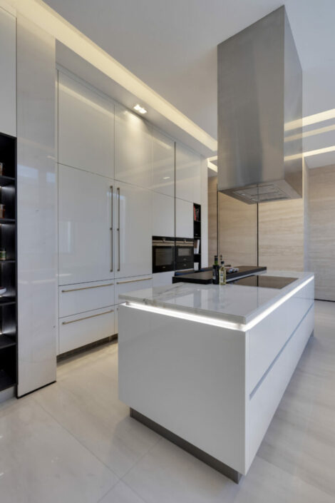 حيث أن هذه الفيلا تشكل ملاذاً مرئياً جذاباً بالرخام الذي يكسو جدرانها الداخلية والخارجية، فقد كان لزاماً إكمال هذا المظهر الثري بتصميم مطبخ للعرض من الدرجة الأولى – next125، وهو ما تم من خلال تشطيبات الأثاث الهادئة باللون الأبيض الكريستالي شديد اللمعان، وبعض اللمسات من الرفوف المفتوحة التي تمزج ما بين البلوط والتبغ في لونها، فتشكل بذلك لوحة شديدة التباين مع الرخام الأبيض الناعم الخاص بالجزيرة وسطح العمل.
