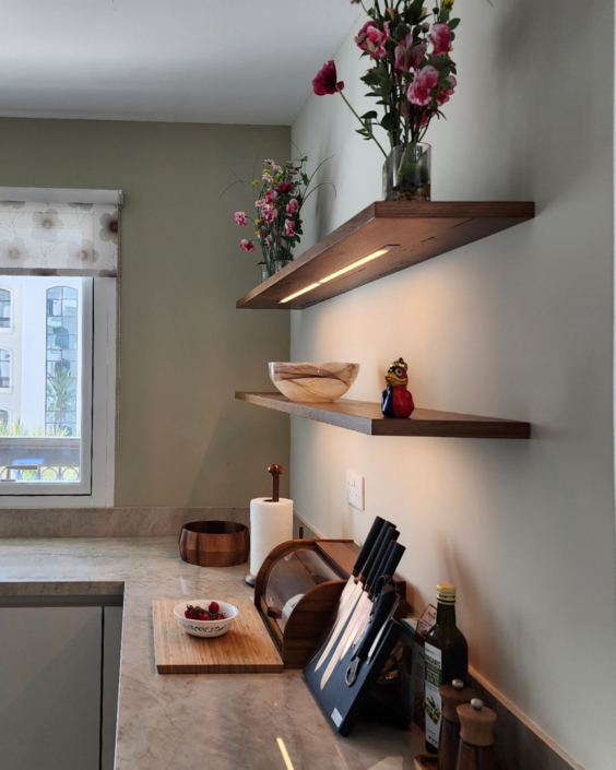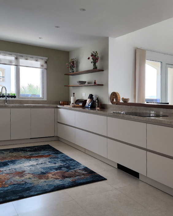 ولأننا نهتم بأدق التفاصيل، قمنا بدمج الأجهزة الكهربائية المخصصة للمطبخ في التصميم، حرصنا على استخدام أجهزة من أفضل العلامات التجارية، فغسالة الأطباق كانت من Siemens، والثلاجة المدمجة والموقد من Elica Nicolatesla مع شفاط مدمج أيضاً. ولا ننسى حوض غسيل الأطباق والخلاط من Franke.