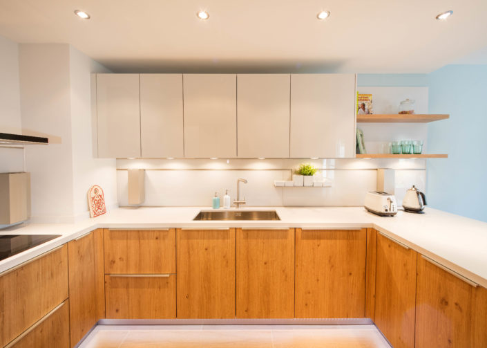 We chose a two-toned palette of high gloss Crystal Grey and layered it with Natural Knotty Oak for a warm contemporary urban look and framed the kitchen with Extreme Iceberg White from Quartzforms for the counter-top.
