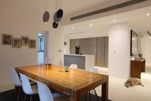 A straight-forward kitchen planned in a linear format. Tall cabinets line by the wall and the kitchen island runs parallel to it. It is a achromatic color palette to give a luxurious aesthetic to the open-plan kitchen. It has a concealed (secret) door incorporated amidst the tall cabinets to have a harmonious look and yet have access to the storage rooom.